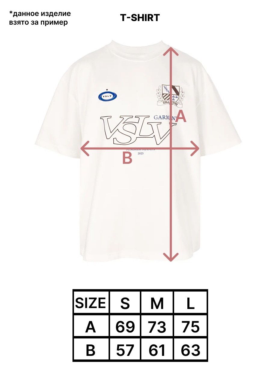 Размерная таблица для футболок A - длина изделия от верхней точки, не включая воротник, до низа. B - ширина изделия под рукавами.