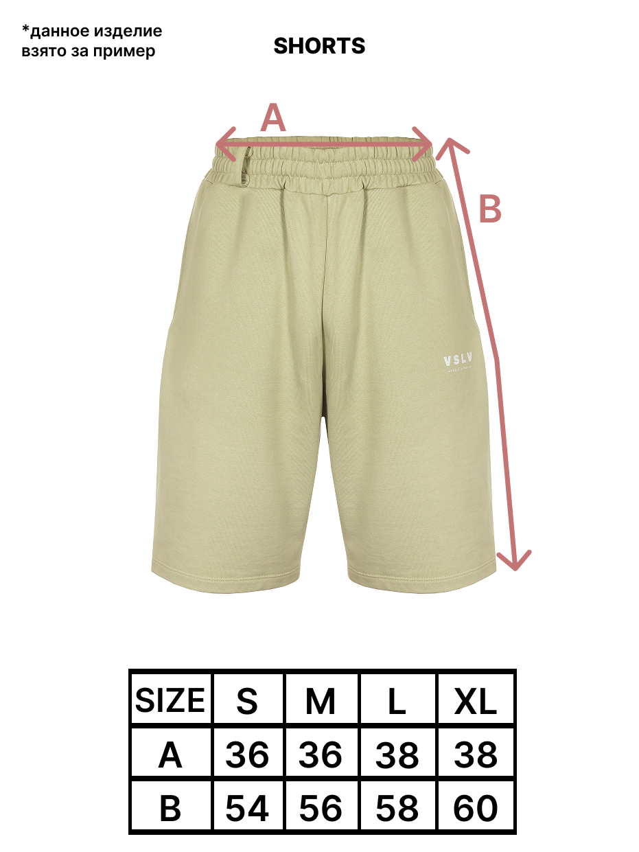 Размерная таблица для шорт A - ширина пояса B - длина изделия по внешнему шву. Пояс на эластичной резинке, регулируется шнурком.