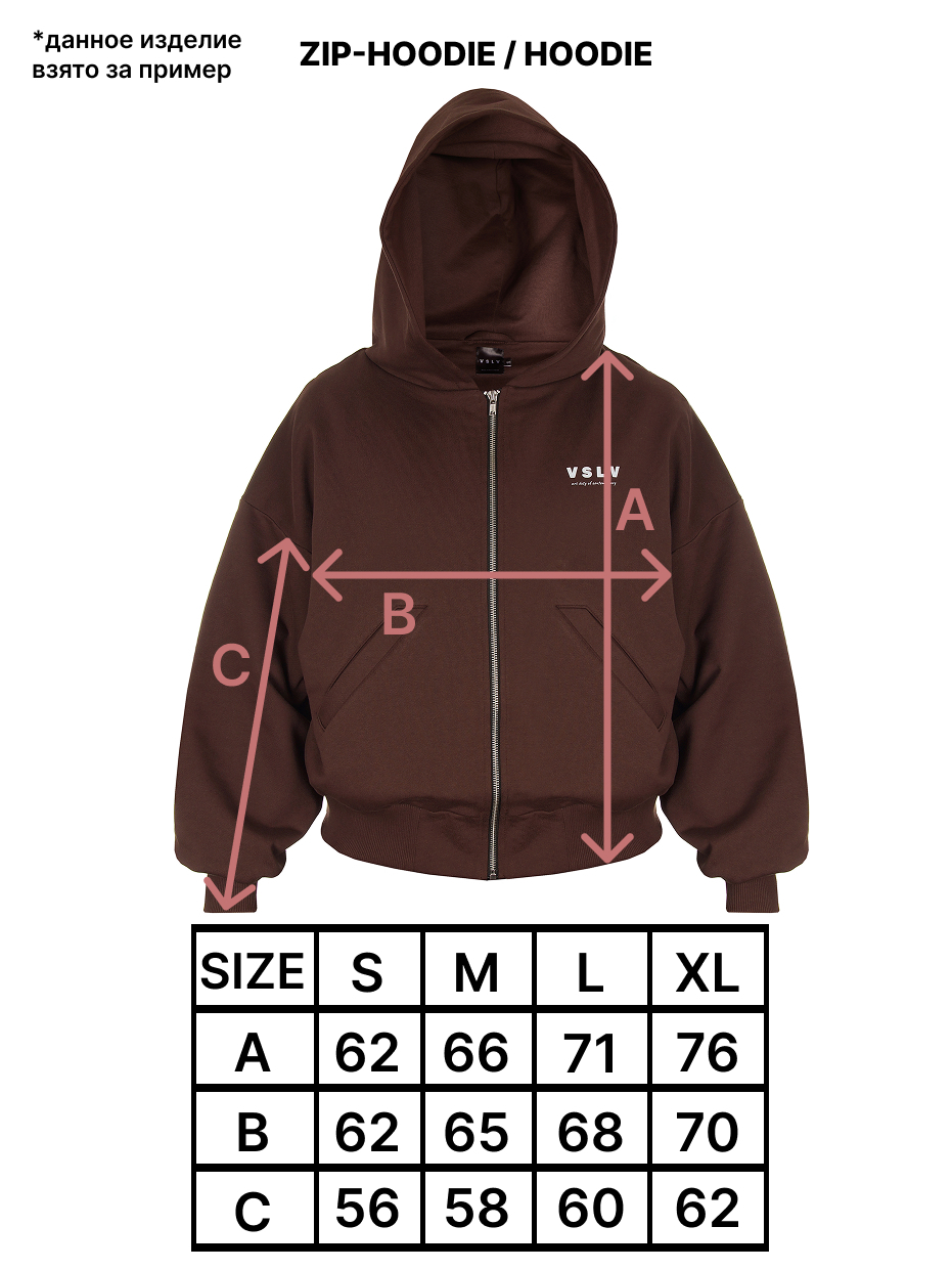 Размерная таблица для худи A - длина изделия от верхней точки плеча до низа. B - ширина изделия под рукавами. C - длина рукава.